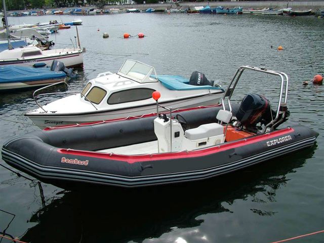 Schlauchboot Bombard Explorer 600 DB, GFK-V-Festrumpf, 6 m lang und 2,45 m breit, max. Zuladung 1660 kg; mit Evinrude-Motor 115 PS (Fichttechnologie –