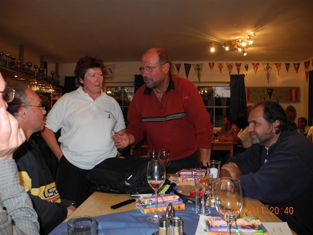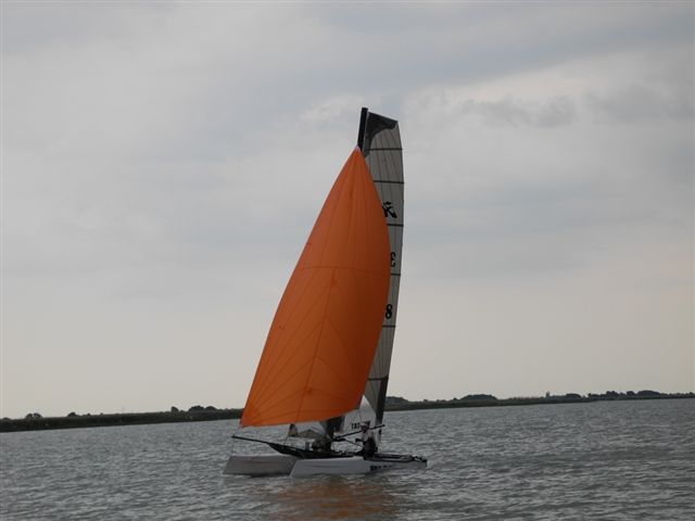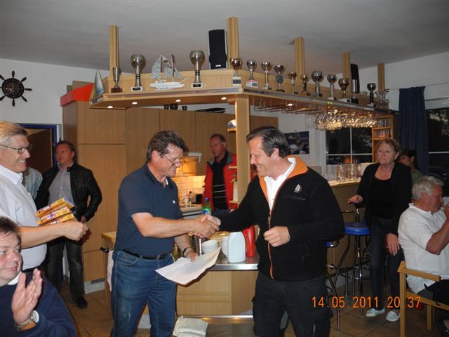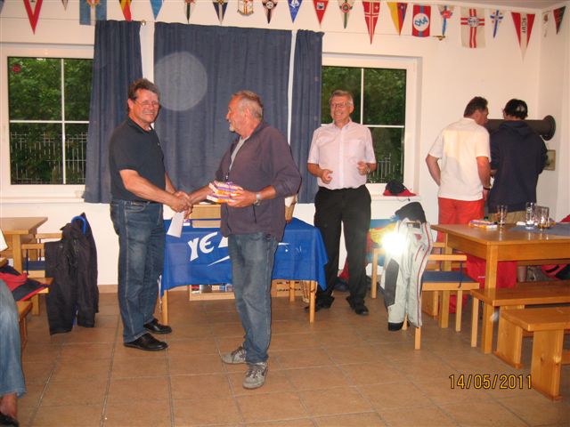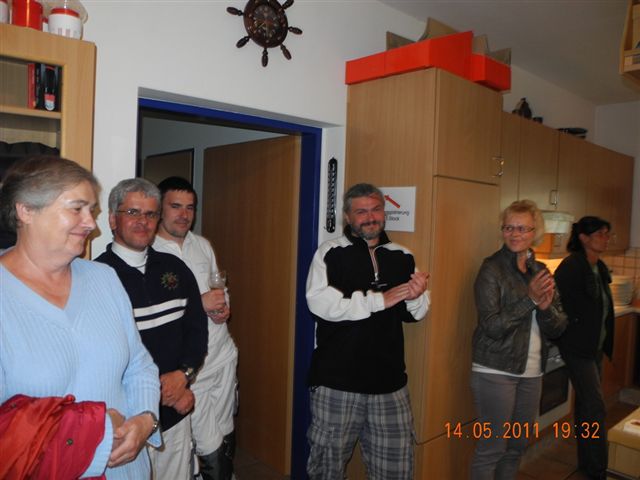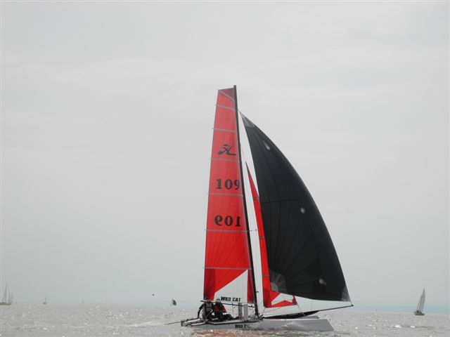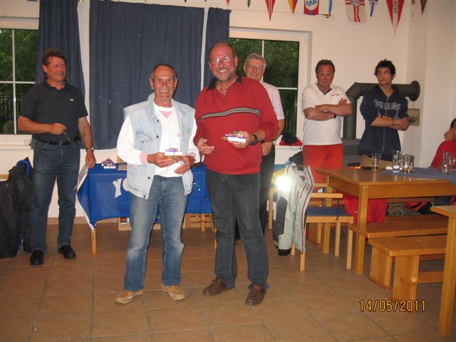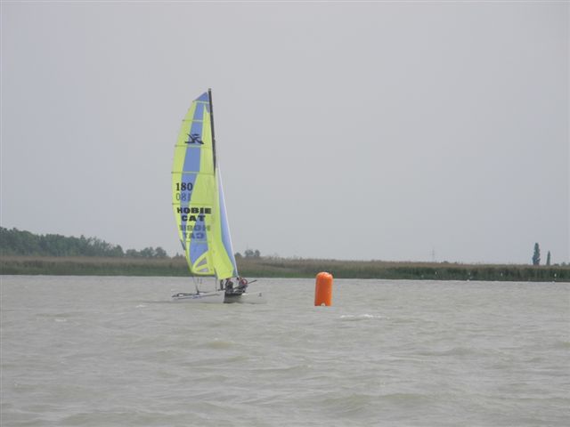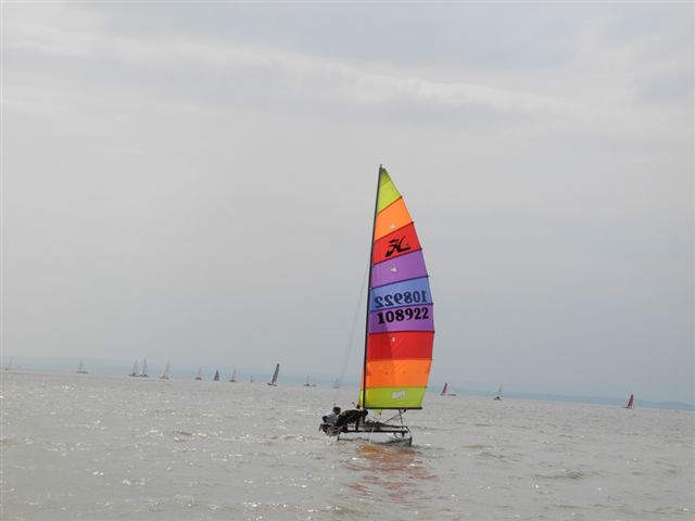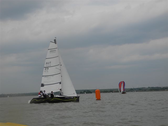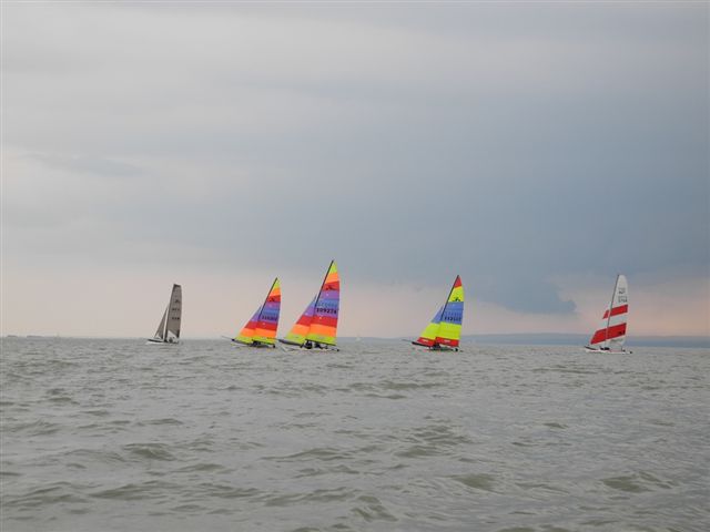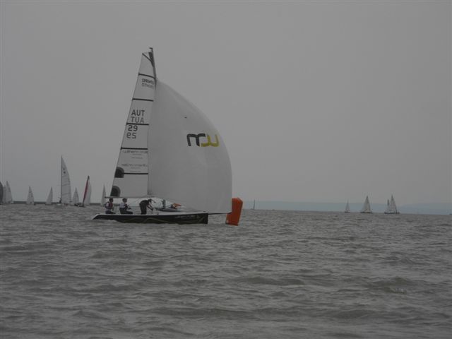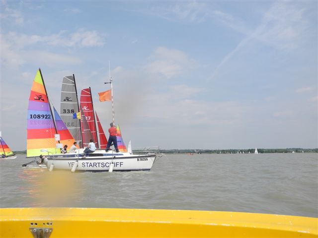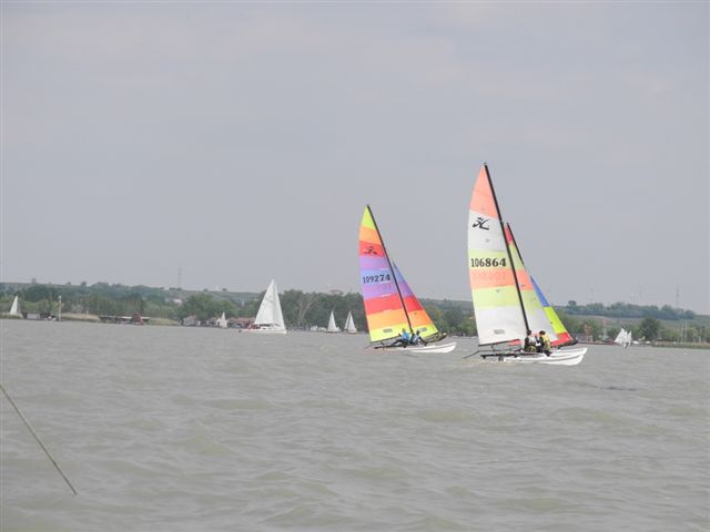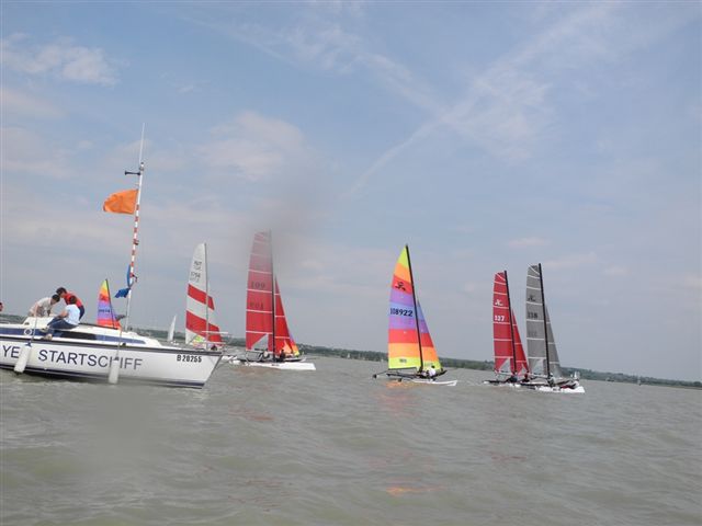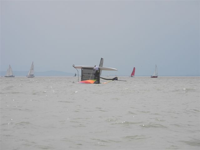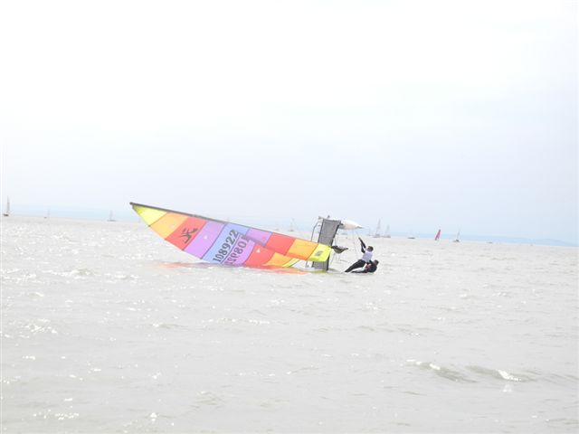 Was danach geschah wird so manchen Teilnehmern aber auch vielen Segelkollegen an Land noch lange in Erinnerung bleiben. Schlagartig setzte Sturm, Hagelschlag und Finsternis ein. Ein Boot kenterte und der Steuermann konnte nur mit größter Anstrengung von unserer Rettungsbootbesatzung gerettet werden. Alle anderen Boote erreichten sicher die Hafeneinfahrt. Doch hier war das Chaos perfekt. Gekenterte Katamarane blockierten die Hafeneinfahrten und die nachfolgenden, mit großer Geschwindigkeit einlaufenden Boote konnten nur mit Mühe die Hafeneinfahrt passieren. Ein Boot drehte ab um eine Kollision zu verhindern und landete im Schilfgürtel. Zu diesem Zeitpunkt wurde im Hafen eine Windgeschwindigkeit von 48 kn gemessen. Dieser Zustand forderte einige bedauernswerte Sachschäden, aber Gott sei Dank keine gesundheitlichen Schäden bei den Teilnehmern.