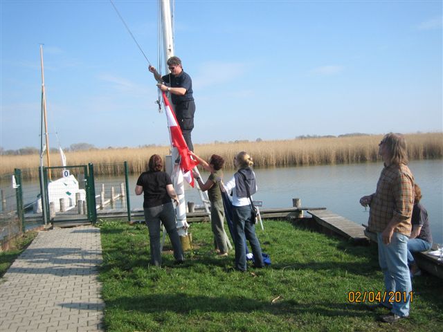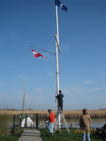 Wie angekündigt fanden am ersten Aprilwochenende die umfangreichen Auswinterungsarbeiten in unserem Club statt. Trotz der durch Erkrankung, Unfälle und Urlaubsaufenthalte gegenüber der Vorjahre reduzierten Anzahl von Clubmitgliedern, welche sich über ihren beglichenen Mitgliedsbeitrag hinaus zur Verfügung stellten und mit ihrer Leistung dazu beitrugen das die Clubkassa geschont und der Clubmitgliedsbeitrag niedrig gehalten werden kann. Alle geplanten Arbeiten wie die Reinigung des Clubhauses, die Auswinterung der Clubboote, die Wasserung und Ausrüstung der Regattaboote, die Beleuchtung der Hafeneinfahrt und zu aller letzt die Flaggenhissung, konnten bis spät am Abend, erfolgreich umgesetzt werden.