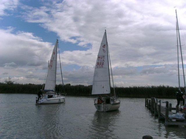 Die Segler hatten mit leichtem Regen und Windböen bis zu 20 Knoten zu kämpfen und absolvierten die 2 Wettfahrten mit Geschick und Taktik. Der Zieleinlauf der ersten Wettfahrt war sehr spannend und es trennten lediglich ca. 20 cm das Boot AUT 135 von AUT 13.