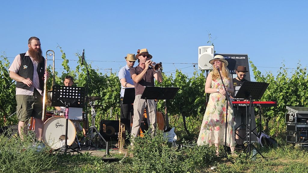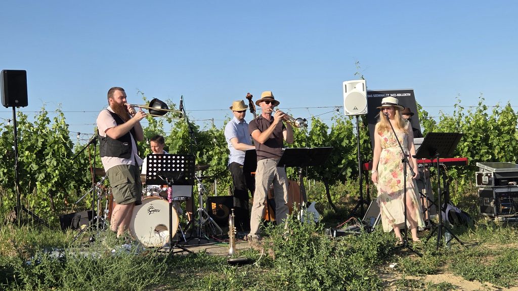 Auf der Aussichtsplattform oder zwischen den Reben ließ es sich, begleitet von den Vibes & Drums von den Musikern des Jazzclub Gols, guten Schmankerln und ausgezeichneten Weinen entspannen und feiern.